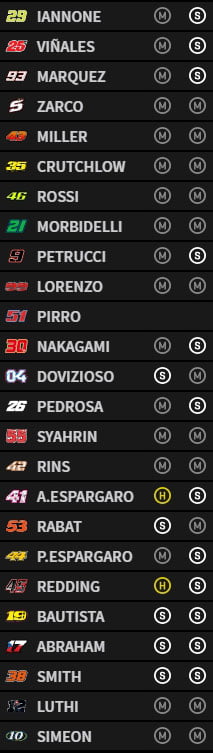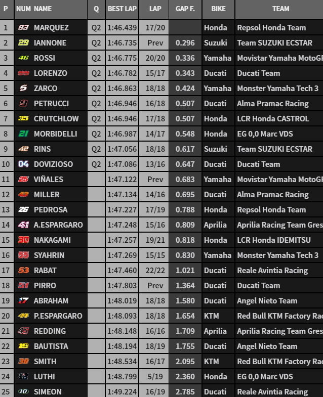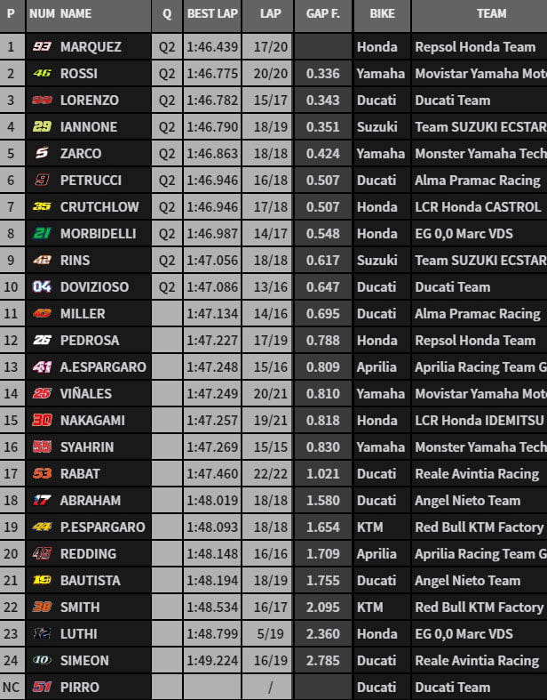 Suivent Johann Zarco, Maverick Vinales et Alex Rins tandis que Dani Pedrosa n’apparaît qu’en 19e position.