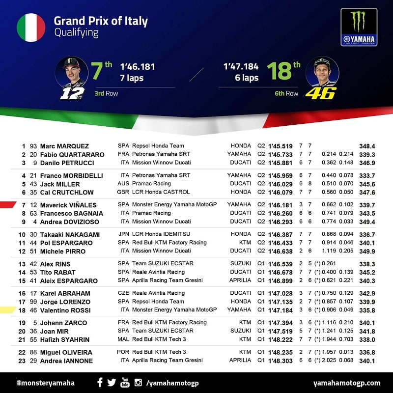 Cette septième place n’est pas très convaincante pour le moment, Maverick s’étant jusqu’à présent toujours mieux qualifié (pole position au Qatar, deuxième en Argentine, sixième à Austin et cinquième à Jerez) à l’exception du Mans où il n’occupait que la onzième place sur la grille. Au Mugello, le côté positif pour lui est qu’il précède son coéquipier Valentino Rossi. Mais le côté négatif est qu’il est derrière les deux Yamaha satellites de Fabio Quartararo et Franco Morbidelli.