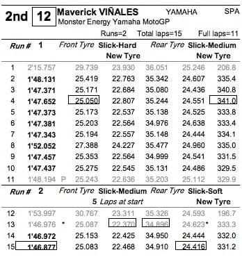 Pour son team manager Massimo Meregalli « La journée ne s’est pas déroulée comme nous le souhaitions. Nous avons fait quelques petits progrès le matin. Maverick s’est qualifié en Q2 sans trop de difficultés, mais à la fin de la troisième séance, il est devenu évident que Vale devrait rejoindre la Q1 en raison d’un problème dans le dernier virage, qui lui a finalement coûté très cher aujourd’hui. Valentino a eu du mal à établir le rythme requis pour entrer en Q2 et, malheureusement, la stratégie qu’il a choisie n’a finalement pas fonctionné ».