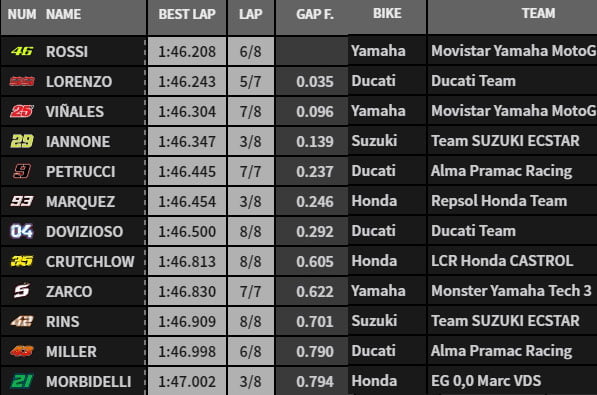 À la fin du premier run, Iannone devance Márquez, Lorenzo, Petrucci, Rossi, Vinales, Dovizioso, Rins, Morbidelli, Zarco, Crutchlow et Miller.