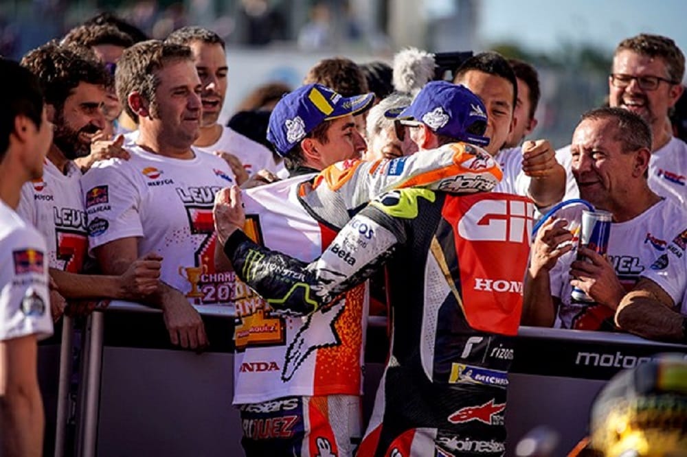 Il termine enfin avec ce clin d’œil : « je suis quand même déçu par Marc qui aurait tout de même pu me laisser gagner. Car il aurait été sacré quand même ! Ce podium Honda à domicile est le bienvenu au Japon. Il récompense aussi mon équipe qui a fait un travail fantastique comme lors de toute cette saison. Je félicite Marc pour son titre, il a fait un travail fantastique cette saison. Il a été incroyable. Alex Rins a également très bien piloté. Je suis impatient de me retrouver en Australie ».