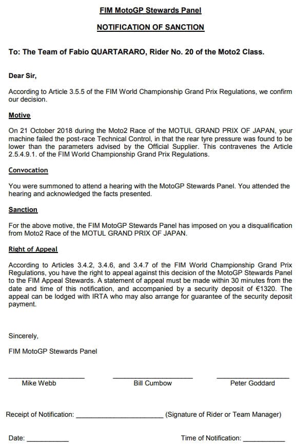 Conformément aux articles 3.4.2, 3.4.6 et 3.4.7 du Règlement des Grand Prix du Championnat du Monde FIM, vous avez le droit de faire appel de cette décision du Comité des commissaires du MotoGP aux commissaires d’appel de la FIM. Une déclaration d’appel doit être faite dans les 30 minutes suivant la date et l’heure de cette notification, accompagnée d’un dépôt de garantie de 1320 €. L’appel peut être interjeté auprès de l’IRTA, qui peut également prendre des dispositions pour le paiement du dépôt de garantie.