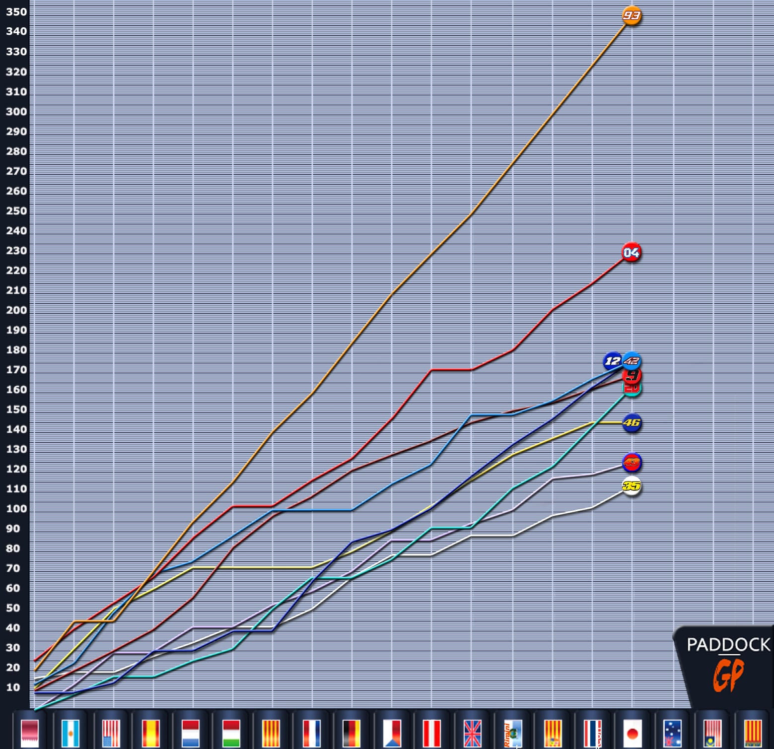 Au Championnat, Danilo cinquième a encore perdu du terrain sur Álex Rins et Maverick Viñales, ex-aequo en troisième position, avec sept points de retard sur ces deux adversaires. Mais où ça se complique pour Petrux, c’est qu’El Diablo est en train de revenir sur lui comme un avion, alignant les podiums avec une maîtrise de plus en plus impressionnante. Petrucci n’a plus maintenant que six points d’avance sur Quartararo, et lui résister lors des trois prochains et derniers Grands Prix ne va pas être facile.