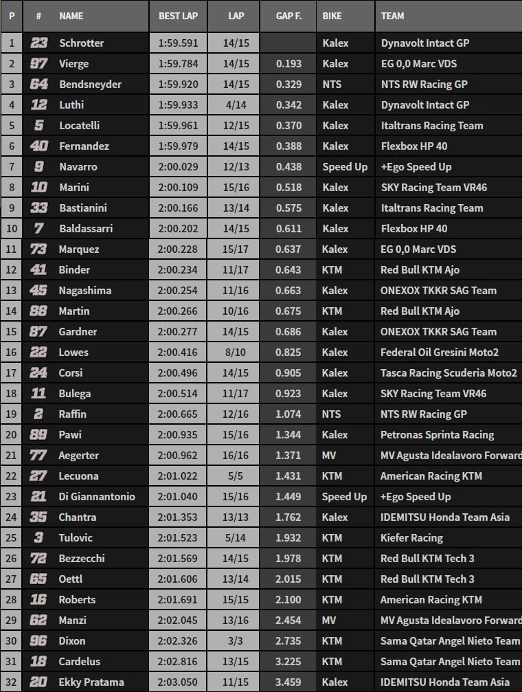 C’est à ce moment que Schrötter, Vierge et un improbable Bo Bendsneyder (NTS, NTS RW Racing GP) sur la NTS dégoupillent. Le premier cité signe un 1’59.591 qui sera invaincu. Le meilleur débutant est Enea Bastianini (Kalex, Italtrans Racing Team), neuvième. La première KTM est douzième avec Binder. Les pilotes Tech3 sont vingt-sixième et vingt-septième. 19 pilotes sont dans la même seconde.
