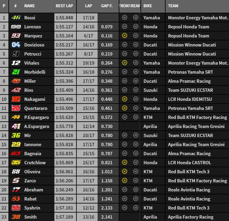 A 2 minutes de la fin de séance, Jorge Lorenzo s’empare de la pole position provisoire en 1’55.127 tandis que Valentino Rossi, bien que gêné par Karel Abraham, réalise le 3e meilleur temps. Le Docteur poursuit alors son effort et réalise le meilleur temps en 1’55.048 pendant que Andrea Dovizioso place sa Ducati GP19 en 3e position provisoire avant de s’en faire déloger par Marc Márquez.