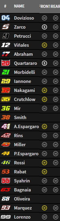 Le premier tour permet de voir quels pneus ont choisi les pilotes, avec une majorité d’arrières médium, alors que l’avant se partage entre médium et dur, à l’exception de Fabio Quartararo et Johann Zarco qui ont opté pour un tendre.