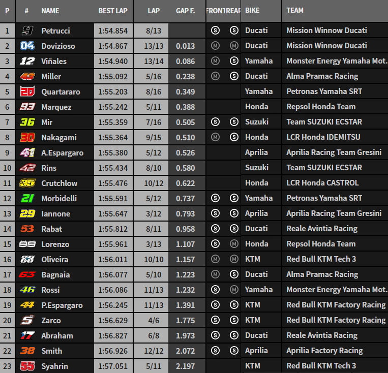 Juste avant la fin du premier run, Danilo Petrucci accélère le rythme en 1’54.854, laissant à 2/10 derrière lui un groupe compact composé de Jack Miller, Maverick Viñales, Andrea Dovizioso, Fabio Quartararo et Marc Márquez. Tous ces pilotes sont en moins de 4 dixièmes alors que Jorge Lorenzo figure en 14e position à plus d’une seconde, et Valentino Rossi en 18e à 1,4 secondes.
