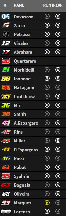 Quasiment tous les pilotes sont maintenant en pneu arrière tendre, à l’exception notable d’Andrea Dovizioso, Jorge Lorenzo, Miguel Oliveira et Valentino Rossi qui ont opté pour un médium.