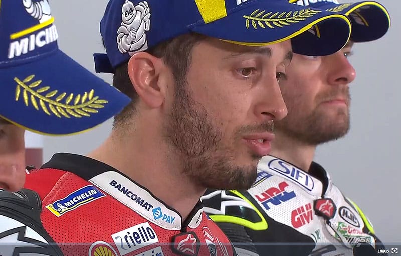 Andrea Dovizioso : « Hum… Je ne savais pas vraiment ce que les autres pouvaient faire. Je m’attendais à ce que Rins parte fort, même s’il a chuté 2 fois hier et qu’il avait peut-être perdu un peu de feeling. Il est très bon en course et je l’ai vu durant le test : sa vitesse au milieu du virage est incroyable. Je pense que sa moto est complètement à l’opposé de la mienne. J’accélère très fort et je peux être très rapide dans la ligne droite, mais je peine beaucoup au milieu des virages. J’ai toujours voulu le freiner car c’était trop tôt pour attaquer. Personne ne pouvait attaquer sur la distance de la course avec le pneu arrière. Donc je pense qu’il est parti trop tôt. Donc j’ai été en mesure de le freiner et de continuer à économiser le pneu, et c’était une stratégie parfaite pour pouvoir se battre avec Marc lors des derniers tours. J’ai commis une erreur au freinage avec le shifting, et Marc m’a dépassé mais cela m’a donné la possibilité de comprendre sa situation ainsi qu’un extra boost car sa situation était pire que la mienne. Il était meilleur au freinage mais ma vitesse était un peu meilleure, donc j’ai tout de suite décidé d’essayer de le doubler dès que possible et d’attaquer, sans lui laisser une possibilité. Bon, à la fin, il a pu me doubler (rires) avec son « Marc Style » qui est très bon pour essayer de doubler, même s’il n’a pas la même vitesse. Mais j’ai pu répondre de la bonne manière car mon accélération était très bonne.