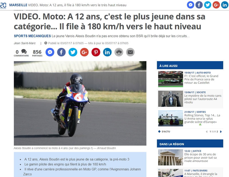 Ainsi, le quotidien « 20 minutes » a diffusé sur son site Internet un reportage complet sur Alexis Boudin qui, malgré ou grâce à son jeune âge, fait aujourd’hui partie avec d’autres des espoirs de la vitesse française.