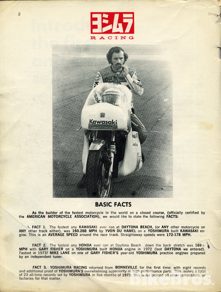 Les commandes pour les moteurs de 900 Kawasaki et les 750 Honda affluent à Simi Valley. En août de la même année, Yoshimura emmène quatre motos, dont une Z1, une CB750 et une CB500, à la Bonneville Speed Week dans l’Utah. Sous la houlette de Pop, et avec Dale Alexander aux commandes, Yoshimura a réussi à battre sept records du monde de vitesse sur les célèbres Salt Flats.
