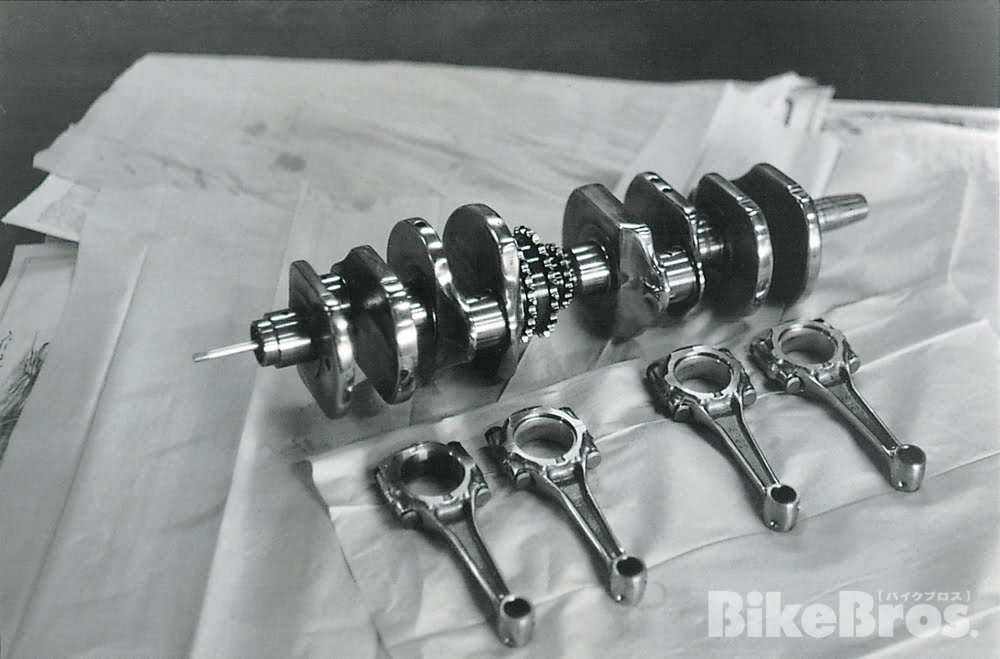 Cette photo d’archive montre un jeu de vilebrequin et de bielles pour CB750 qui a subi un processus de polissage miroir visant à améliorer la résistance et à réduire la friction. Le polissage était le travail habituel de Yoshimura depuis les CB72. Tout fait à la main à l’aide de ponceuses électriques, le processus était une tâche incroyablement longue.