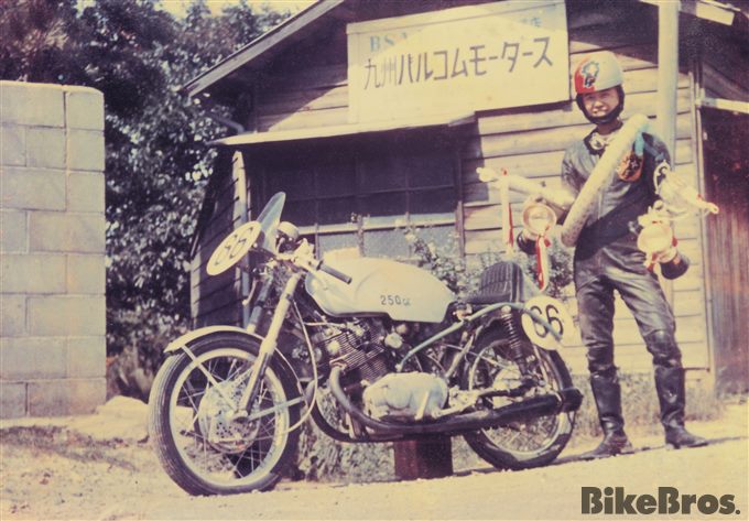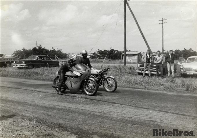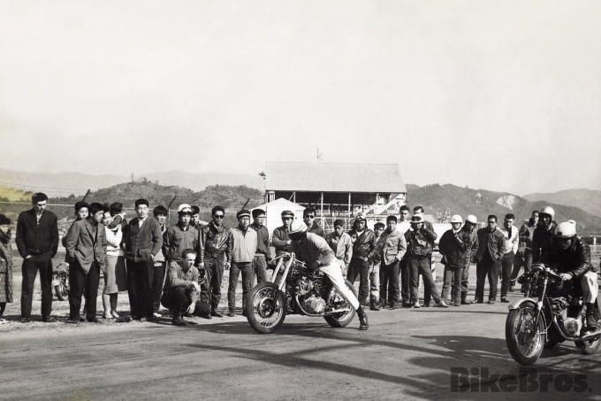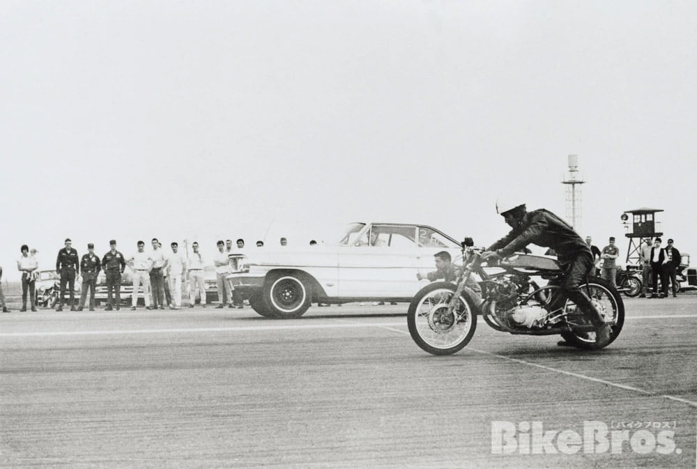 Environ un an après l’ouverture du magasin, Hideo est invité à participer à des courses d’accélération sur la base aérienne d’Itazuke. À l’époque, la Kyushu Timing Association (KTA), un club de motards militaires de la base américaine, organise des courses individuelles d’un quart de mile en utilisant une piste secondaire. Hideo y pilote une Cabton 600 (un twin parallèle OHV fabriqué au Japon) et il est fasciné par la sensation similaire à celle que vous ressentez lorsque vous décollez dans un avion.