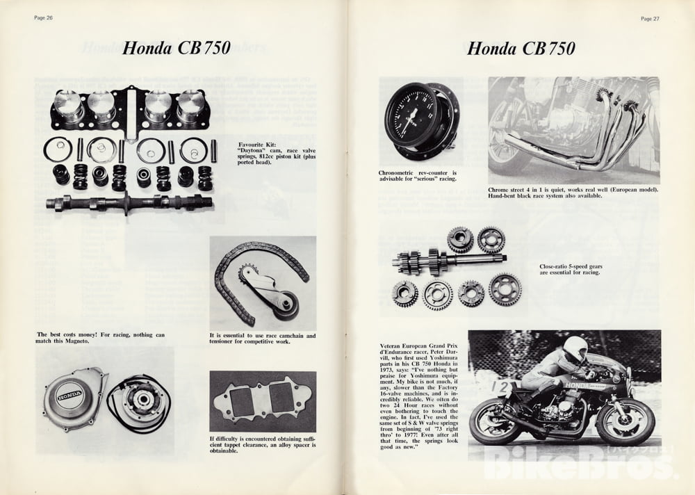 À l’usine d’Akigawa, Yoshimura commence donc à explorer le potentiel de la CB750 en utilisant sa K0 comme mulet de test, et développe des pièces de performance telles que des cames à grande levée et des kits de pistons à gros alésage (la version initiale était le kit de piston 810/812cc 64mm puis le kit de pistons 823cc 64,5 mm a été ajouté; tous deux basés sur les pistons d’origine pour le CB350 twin). Les carburateurs CR et la transmission à rapports rapprochés ont été fournis par Honda RSC.
