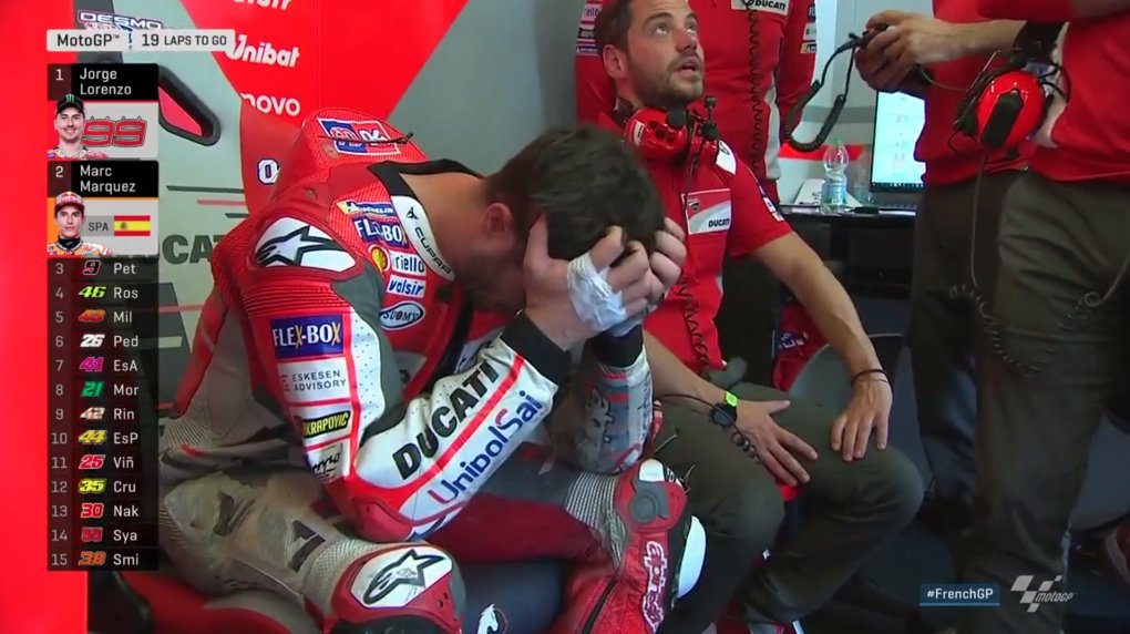 C’est un Andrea Dovizioso anéanti comme rarement et qui est longtemps resté en détresse dans son box Ducati que l’on a vu au Mans. Celui qui a renouvelé pour deux ans avec les rouges s’en voulait de ce qu’il reconnaît être comme son erreur, sa bévue, d’autant plus dure à avaler qu’il avait, selon ses dires, de quoi gagner entre les mains. Il venait de prendre la tête du Grand Prix de France et il pensait avoir fait le plus dur. Mais le virage suivant l’a fait redescendre sur terre. Brutalement.