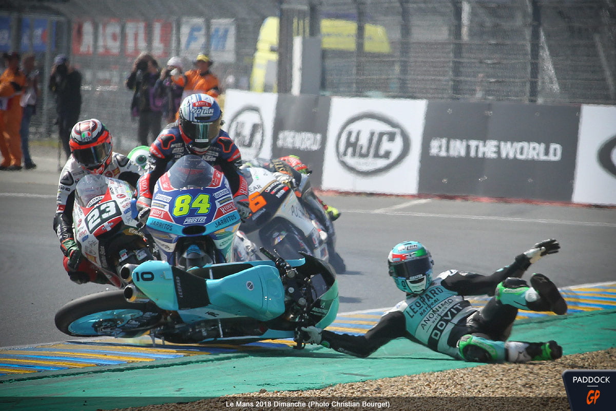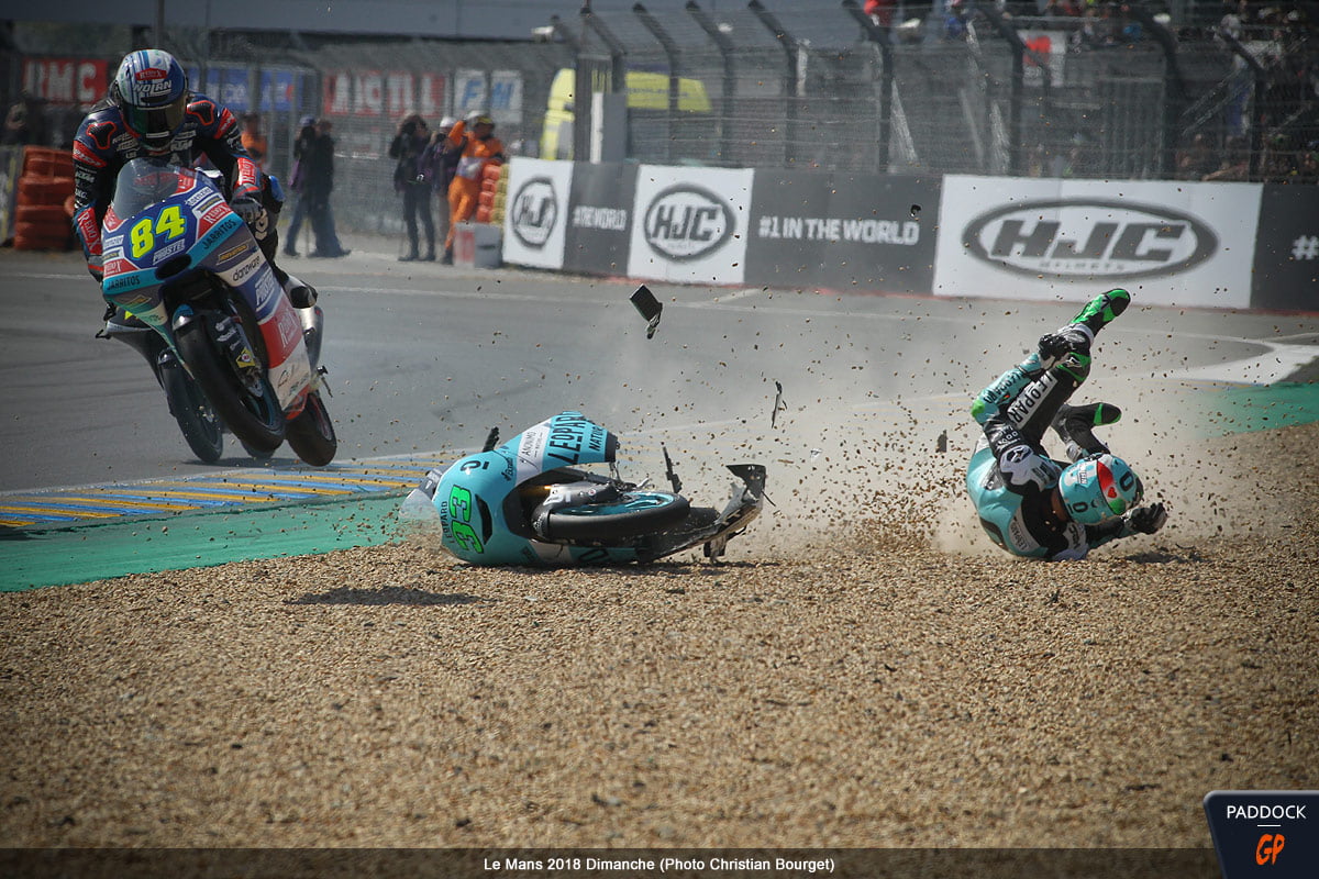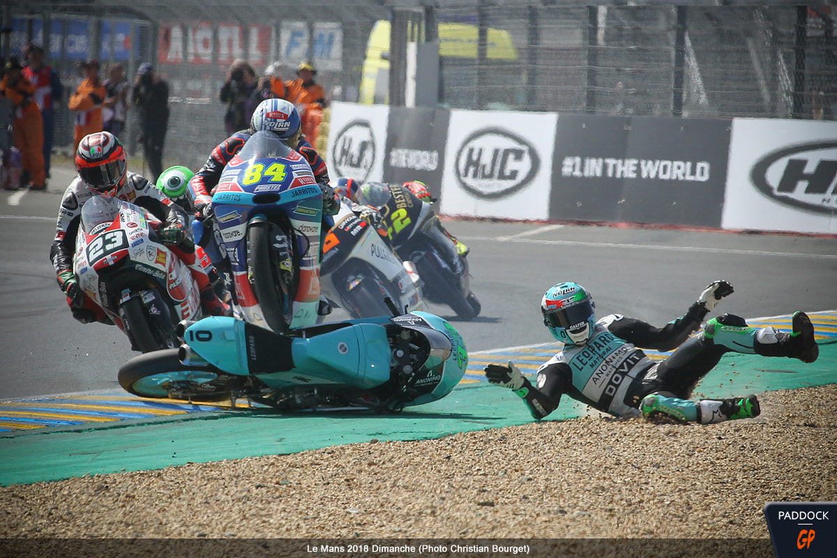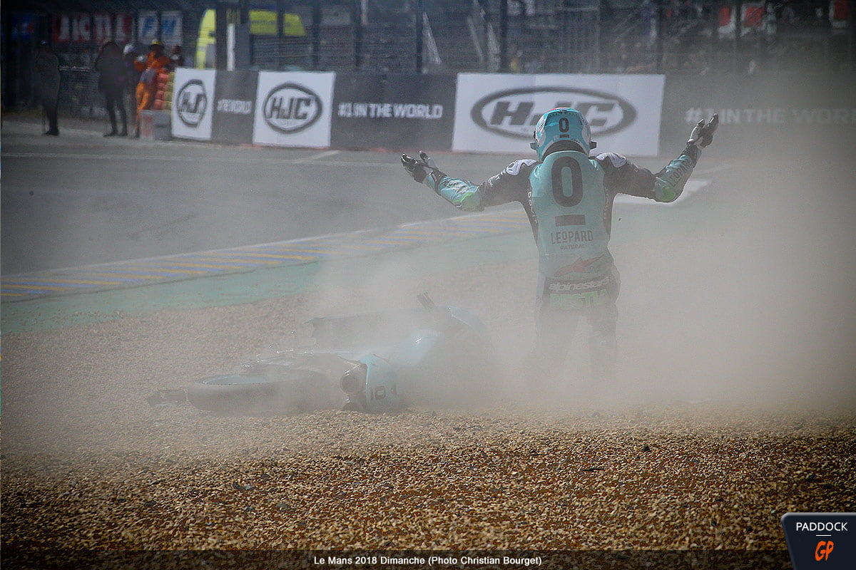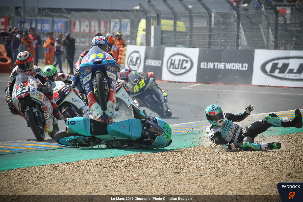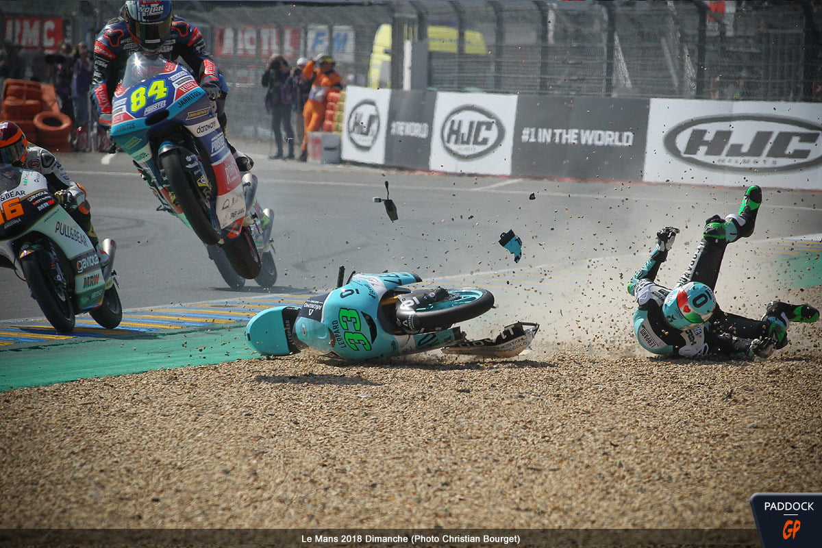 Quand, au 21e tour d’un Grand Prix de France Moto3 qui en comptait 22, l’Italien Enea Bastianini du team Leopard Racing perd le contrôle de sa Honda NSF 250 RW, cela aurait pu être une simple chute comme les 108 autres survenues le week-end dernier au Mans…