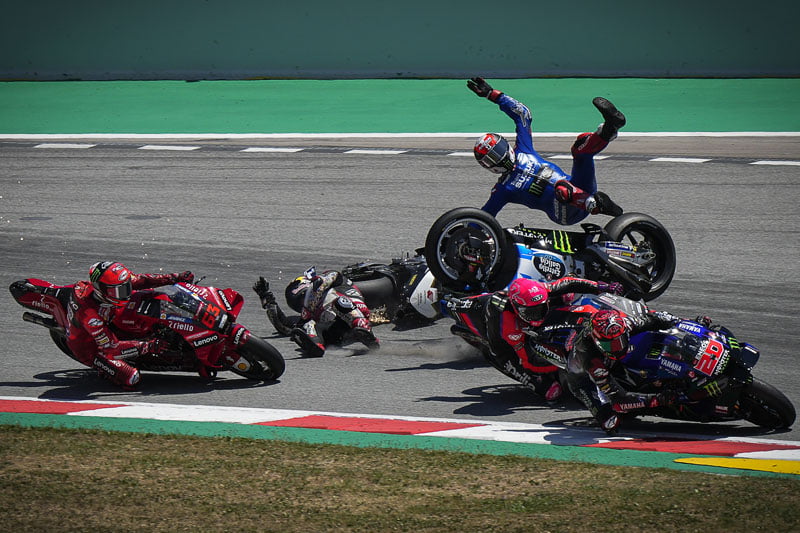 Bien sûr, il peut engager celle des autres lorsqu’il emmène avec lui d’autres pilotes qui n’en demandent pas tant, et c’est ce qu’a vécu l’infortuné Nakagami en fauchant Rins et Bagnaia (avec son casque !) au premier virage du Grand Prix de Catalogne. Mais à moins qu’il ne s’agisse d’une glissade volontaire ou qu’il sorte outrageusement des règles, une erreur de jugement sur un moment aussi critique et hasardeux qu’un freinage appuyé au premier virage relève d’un strict fait de course, parfaitement analysé par la direction de course.
