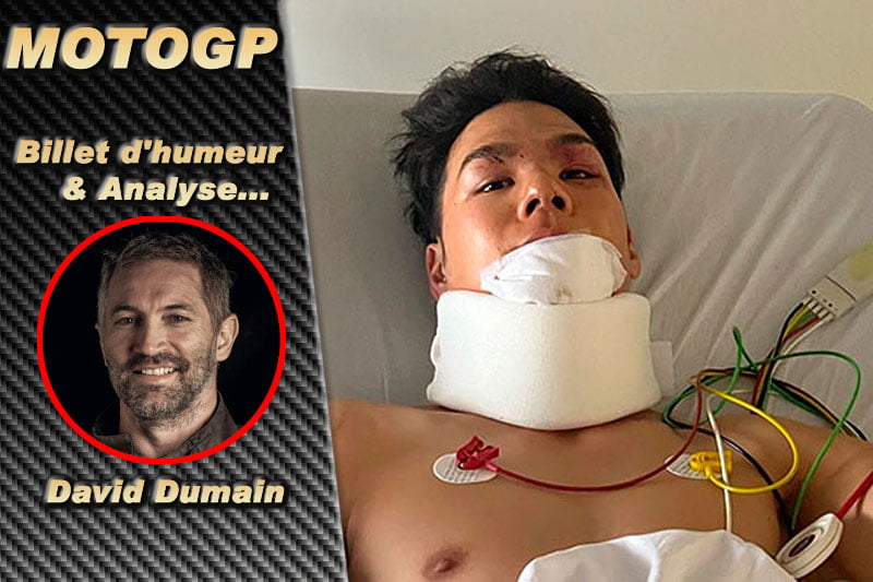 L’acte de contrition de Takaaki Nakagami sur son lit d’hôpital, le cou enserré dans une minerve et le corps bardé de perfusions, serre le cœur et renvoie le paddock et sa meute hurlante à une réalité du sport moto qui s’oublie vite dès lors qu’un enjeu sportif entre en ligne de compte : un pilote qui chute engage d’abord sa propre peau.