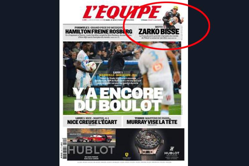 Le quotidien sportif tricolore l’Equipe a justement célébré le second titre mondial de notre compatriote en Moto2. C’est une bonne chose. Être à la une, même en vignette à droite, ce n’est pas si mal pour un pilote de Moto2.
