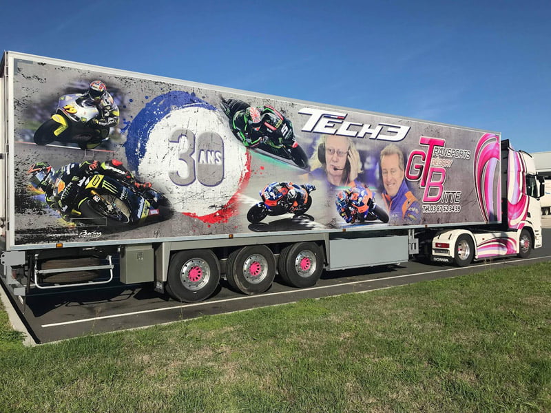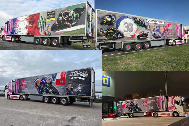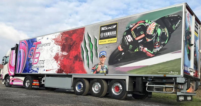 À l’époque, Johann Zarco marchait bien chez Tech3 et j’ai eu l’occasion de rencontrer Hervé Poncharal qui m’a gentiment accordé l’autorisation de faire figurer son pilote sur un de mes camions. Je lui ai envoyé le projet et il a trouvé ça super, donc cette décoration a été créée en 2018. Évidemment, il n’y a absolument aucune retombée professionnelle et c’est uniquement un plaisir personnel, afin de faire connaître la compétition moto de vitesse et ses champions français à monsieur tout le monde sur les routes de France. »