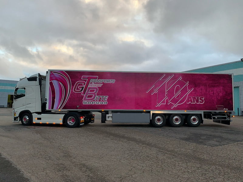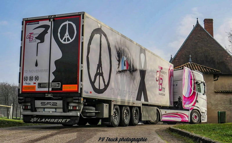 Grégory Bitte : « J’ai créé ma société de transport en juin 2011 et, en janvier 2015, j’ai comme, tout le monde, été profondément marqué par l’attentat contre Charlie Hebdo. L’idée m’est donc venue de faire une semi-remorque pour rendre hommage aux victimes, mais à l’époque l’avocate du journal avait refusé, au nom du droit à l’image des personnes. Je n’avais donc pas insisté mais malheureusement, quelques mois plus tard, les attentats de Paris nous ont à nouveau meurtris et, une fois de plus, j’ai tenu à rendre hommage et à manifester ma solidarité avec les familles des victimes. Nous avons donc créé la décoration d’une première semi-remorque. »