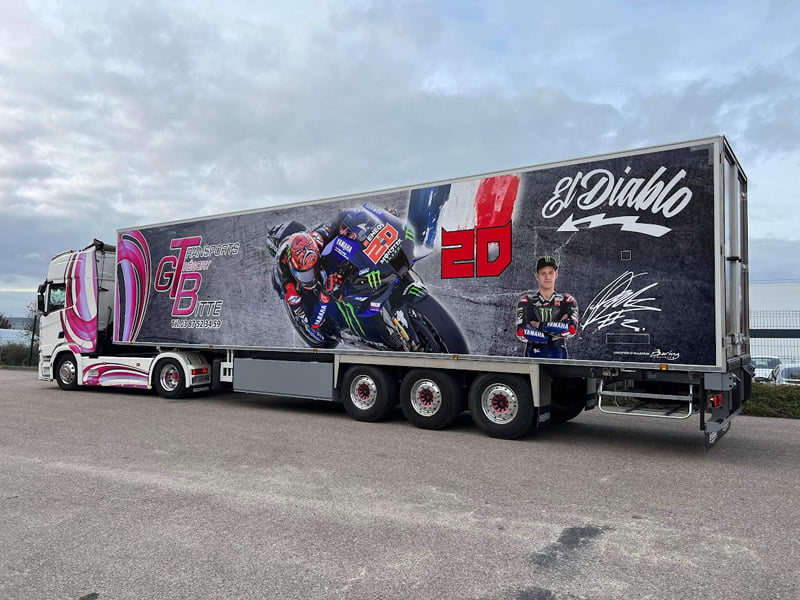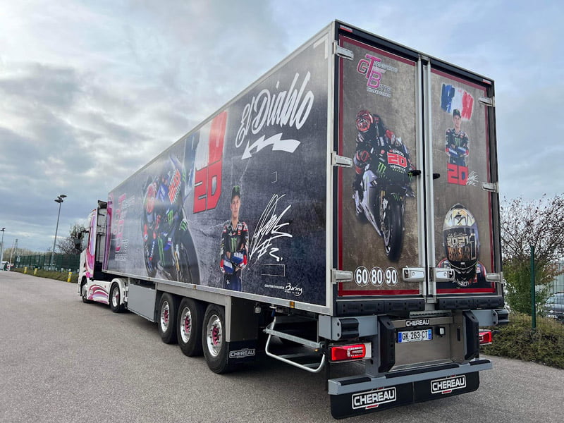 « Mais comme j’ai deux gamins, l’un est fan de Johann Zarco et l’autre de Fabio Quartararo. Vous imaginez donc ce qui s’est passé, et j’ai donc demandé au papa de Fabio Quartararo, Étienne, l’autorisation de décorer une semi-remorque à l’image de son fils, ce qu’il m’a gentiment accordé. »