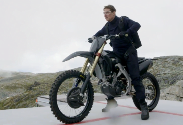 Pour arriver à filmer la scène, Tom Cruise a d’abord suivi des cours de motocross. De la vidéo on apprend que la production – dans ce genre de film aucune dépense n’est épargnée, budget 290 millions de dollars – a créé un court croisé spécifiquement pour l’acteur, avec des courbes bancaires accentuées et des sauts à sa mesure. Pour effectuer cette séquence, présentée comme « la plus grande cascade de l’histoire » par le studio Paramount, le comédien s’est préparé pendant très longtemps jusqu’au tournage en 2020 à Hellesylt en Norvège. « C’est la première fois qu’on prend un tel risque », déclare un membre de l’équipe. « Il faisait 30 sauts par jour. À la fin, Tom était devenu un robot. Au total, il a fait plus de 500 sauts en parachutes et 13.000 sauts en motocross ».