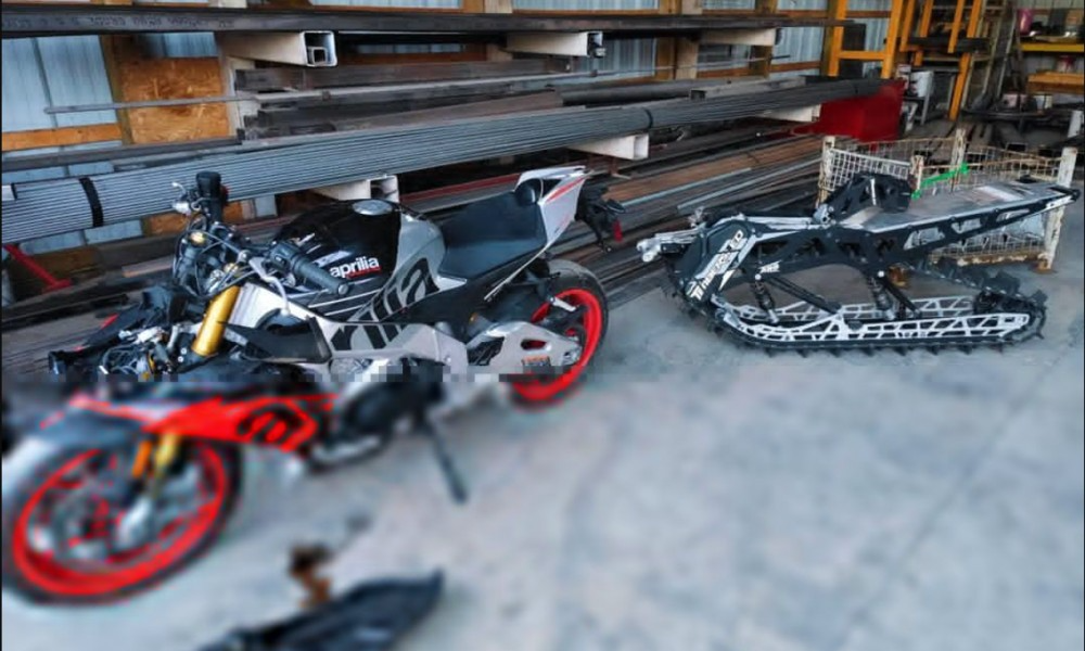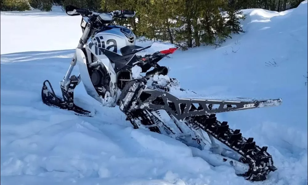 L’Aprilia RSV4 a été transformée en une motoneige très performante qui « laboure » les routes enneigées. La moto a conservé le moteur V4 de 1 099 cc qui produit 214 ch et 126 Nm de couple, mais tout le reste a été dépouillé : roues, freins, échappement, carénage, bras oscillant et suspension.