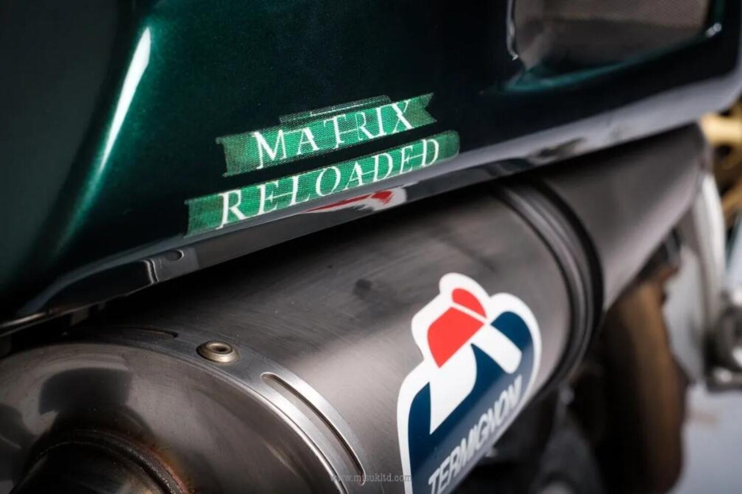 Une Ducati passe à toute vitesse, slalomant entre les voitures et évitant les balles au passage… La moto est une 996 verte, et la scène en question est l’une des séquences les plus célèbres que le cinéma hollywoodien nous ait offertes ces vingt dernières années : on parle évidemment de la fameuse poursuite présente dans Matrix Reloaded, la course folle qui voit Trinity à son guidon. Peu de temps après la sortie du film, pour célébrer « l’apparition » pleine d’adrénaline dans le deuxième chapitre de la saga, l’usine de Borgo Panigale a lancé sur le marché une version spéciale, produite en 2004 dans une série limitée de seulement 250 unités, et dont l’un d’entre eux est en vente chez le spécialiste britannique MIS qui s’occupe de redonner vie à d’anciennes gloires.