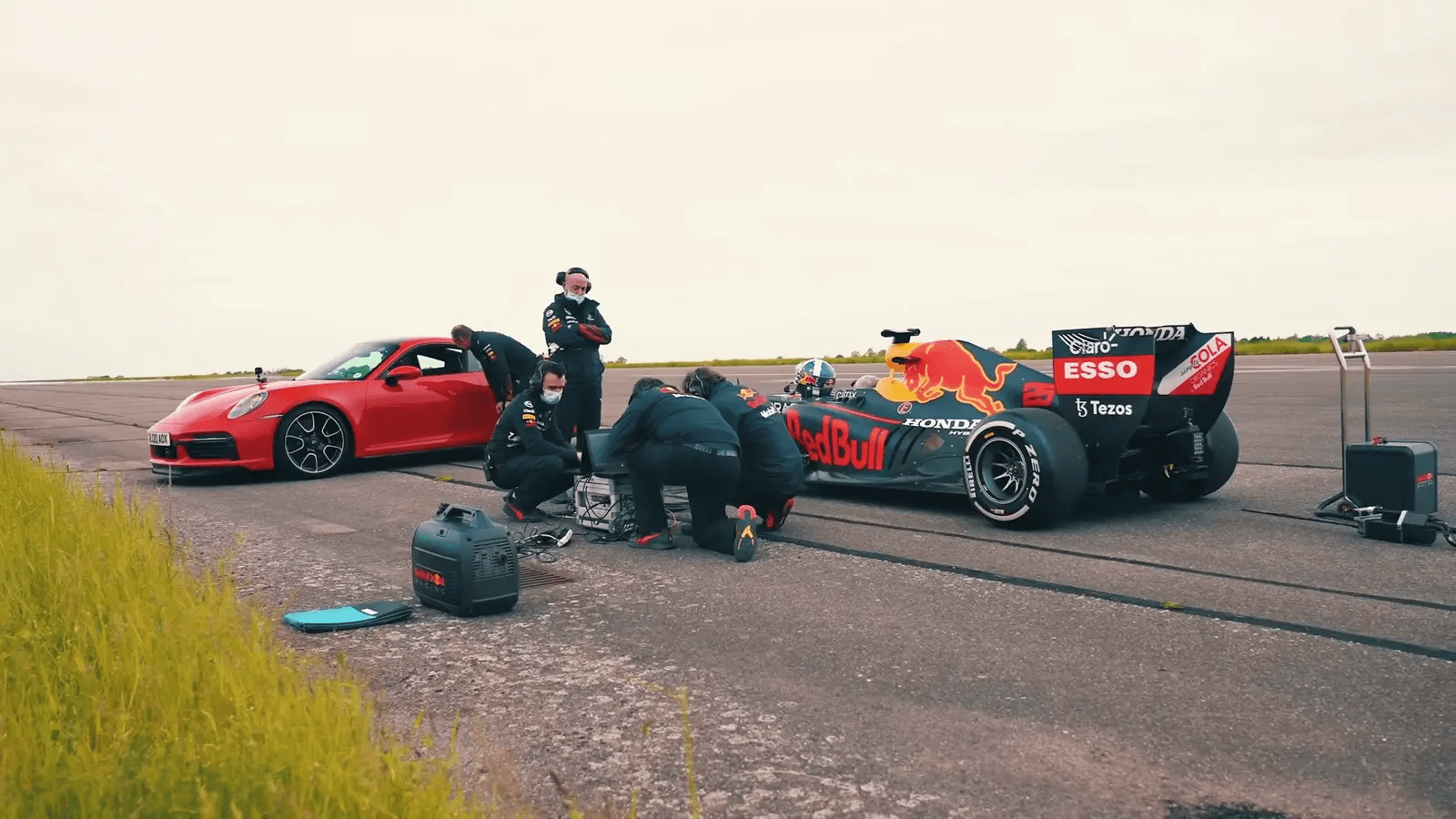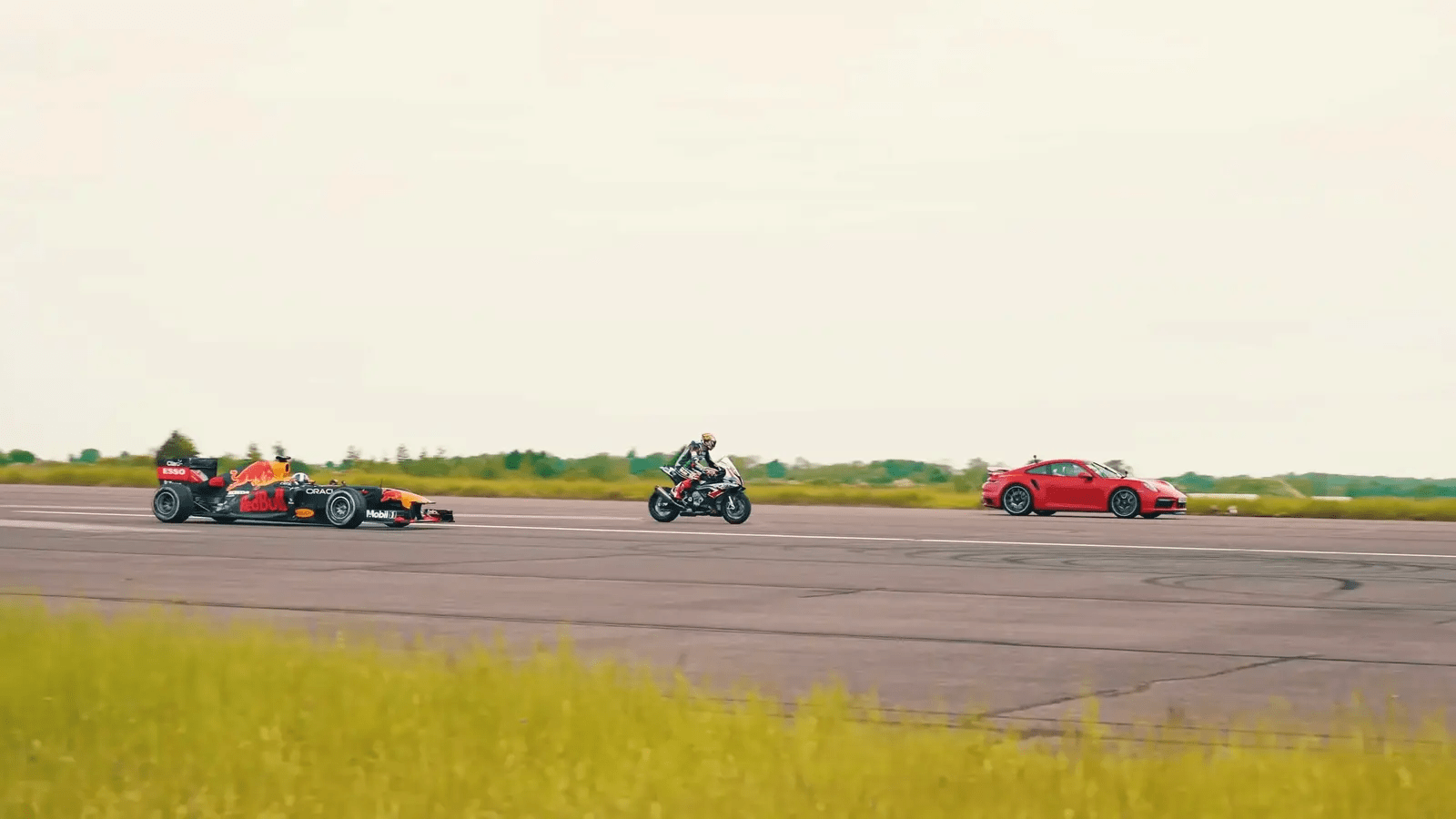 Trois comparatifs ont été réalisés. Tout d’abord, une accélération sur un quart de mile. Au départ, la Porsche, avec sa traction intégrale, prend un bon départ. La BMW M1000RR n’était pas loin derrière la F1. Cependant, les Red Bull et BMW de course ont rapidement rattrapé la Porsche. D’abord, c’était la F1. Après avoir trouvé de la traction, elle est passée devant la 911.