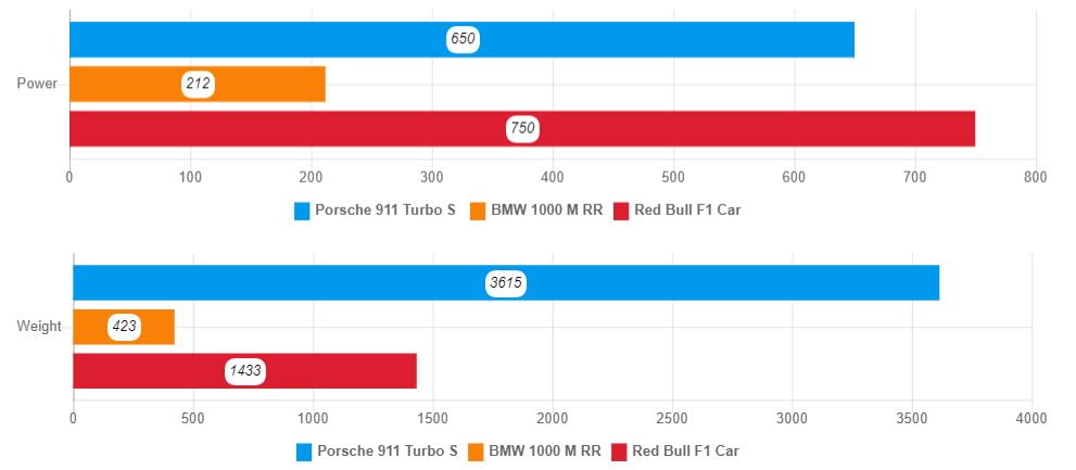 Commençons par la comparer à la Porsche 911 Turbo S 2021. Son six cylindres à plat biturbo de 3,8 litres n’est pas en reste non plus, délivrant 650 ch et 800 Nm aux quatre roues via une boîte de vitesses automatique à double embrayage à huit rapports. D’un autre côté, avec un poids de 1640 kg, la Porsche a beaucoup plus de poids à transporter sur la piste, puisque c’est environ 2 ½ fois le poids de la RB7 et plus de 8 fois celui de la M1000RR. En prenant en compte les deux chiffres, nous obtenons un rapport de 2,52 kg/ch. Avantage : M 1000 RR, mais il faut quand même tenir compte de la F1.