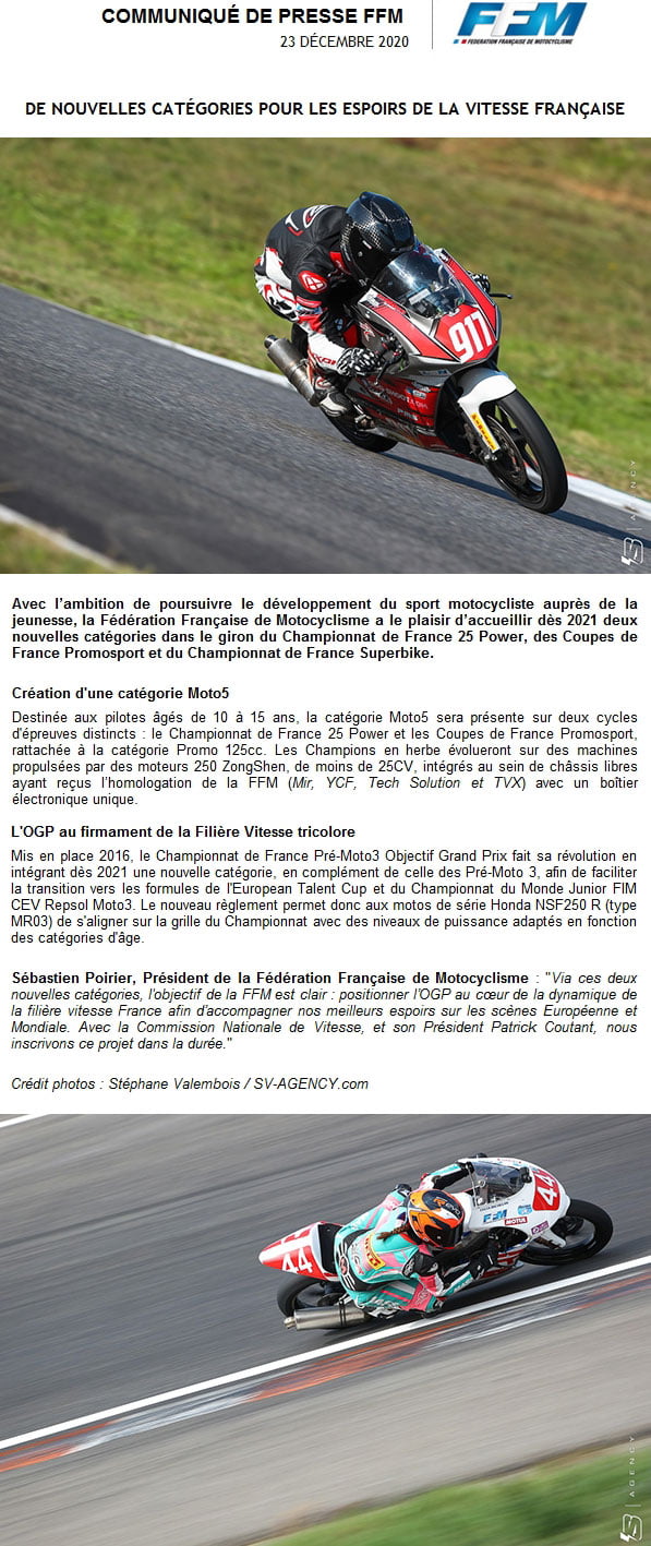 « Enfin, en 2021, toujours avec la Commission Nationale de Vitesse, nous allons créer une nouvelle catégorie de motos qui sera la catégorie Moto5, qui permettra de faire le lien entre le 25 Power et les grands circuits, avec pour objectif d’optimiser le niveau général de nos jeunes champions en vitesse. »
