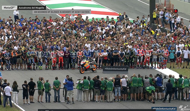 69 secondes de lourd silence, de communion non feinte au vu de l’attitude des pilotes et le respect d’une foule déjà nombreuse et surtout bardée de jaune en l’honneur de celui que Nicky Hayden avait vaincu pour le titre de Champion du Monde 2006.
