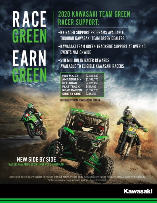 Kawasaki Motors Corp. aux États-Unis renouvelle le programme Team Green Racer Rewards qui continue de fixer la barre pour soutenir les coureurs amateurs et professionnels de Kawasaki. Pour l’année du programme 2020, le programme demeure inégalé puisque le total des récompenses disponibles augmente à plus de 10 millions de dollars, offerts aux coureurs admissibles à plus de 500 événements de course tout au long de l’année. En plus de son soutien inégalé en bordure de piste et du soutien traditionnel du programme Racer Rewards pour le motocross, la course hors route, la course sur route et le flat track, Kawasaki étend son programme Racer Rewards à certains événements parallèles. Le nouveau Programme de récompenses coïncide avec le lancement du tout nouveau Teryx KRX1000 de Kawasaki, et offre des récompenses à plus de 40 événements de course avec près de 300 000 $ disponibles pour les coureurs.