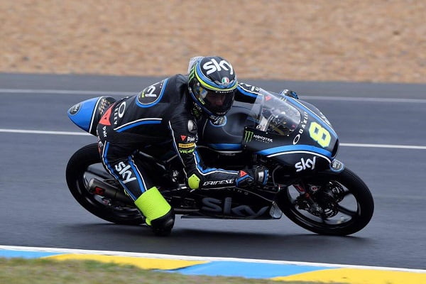 L’un des poulains de Valentino Rossi, Nicolo Bulega engagé sous les couleurs du Sky Racing Team VR46, a totalement dominé la première séance sous la pluie devant son coéquipier du Sky Racing Team VR46 Andrea Migno, Romano Fenati, Aron Canet, Manuel Pagliani (pilote du CIP d’Alain Bronec) et Fabio di Giannantonio.
