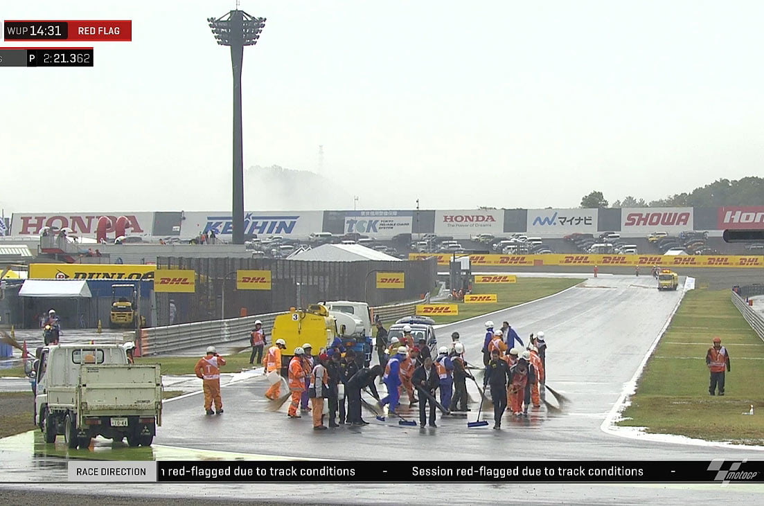 Suite à l’interruption d’une heure quarante lors du warm up des Moto3, les warm up sont réduits à 15 minutes en Moto2 et MotoGP, 10 minutes en Moto3.