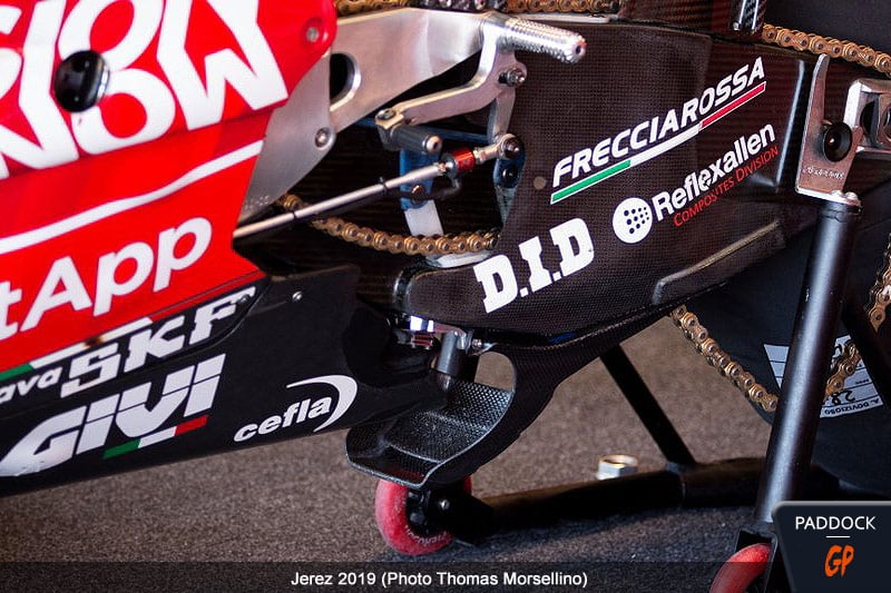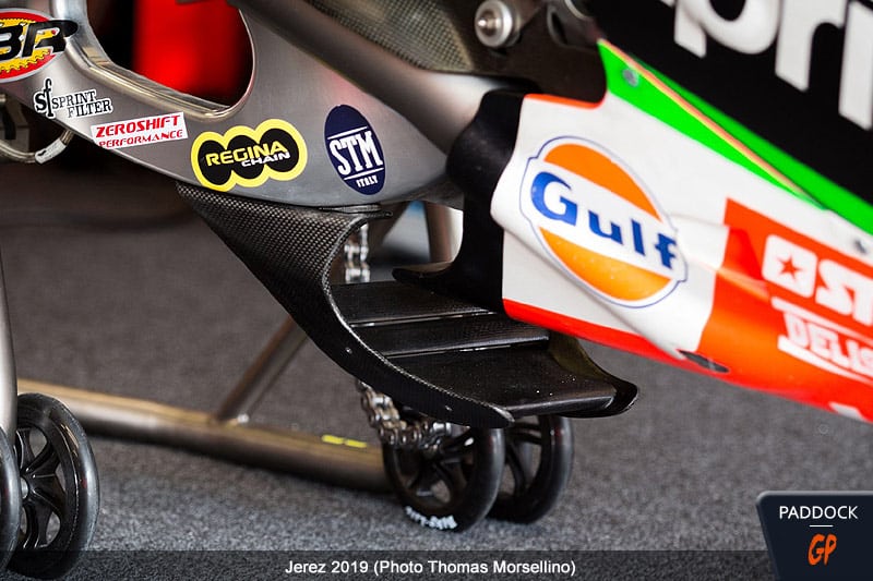 Après avoir mené la fronde contre Ducati, la firme de Noale a sorti son propre aileron de bras oscillant…