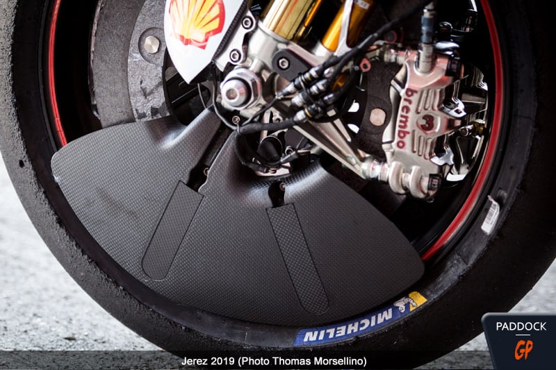 La firme de Borgo Panigale continue à utiliser son aileron de bras oscillant (en fait 3 modèles différents) mais a aussi augmenté notablement la taille des appendices aérodynamiques destinés à canaliser l’air autour de la roue avant.