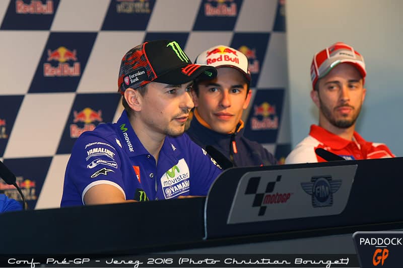 Si le sujet principal de cette conférence de presse était la signature de Lorenzo, Marc Marquez reste le leader au classement provisoire en arrivant à Jerez, « Lorenzo est toujours assez fort à Jerez. Les Yamaha semblent plus à l’aise sur ce tracé, » précise le pilote Honda. « De notre côté, nous verrons. Nous avons réalisé un test ici en novembre dernier et il y a eu beaucoup de changements depuis. » À noter que Paolo Ciabatti et Gigi Dall’Igna ont tenu une conférence de presse durant laquelle ils ont confirmé avoir discuté avec Marquez.