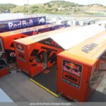 Le jeudi, le paddock est quasiment finalisé pendant que les pilotes s’adressent à la presse et que les mécaniciens démontent et remontent les motos…