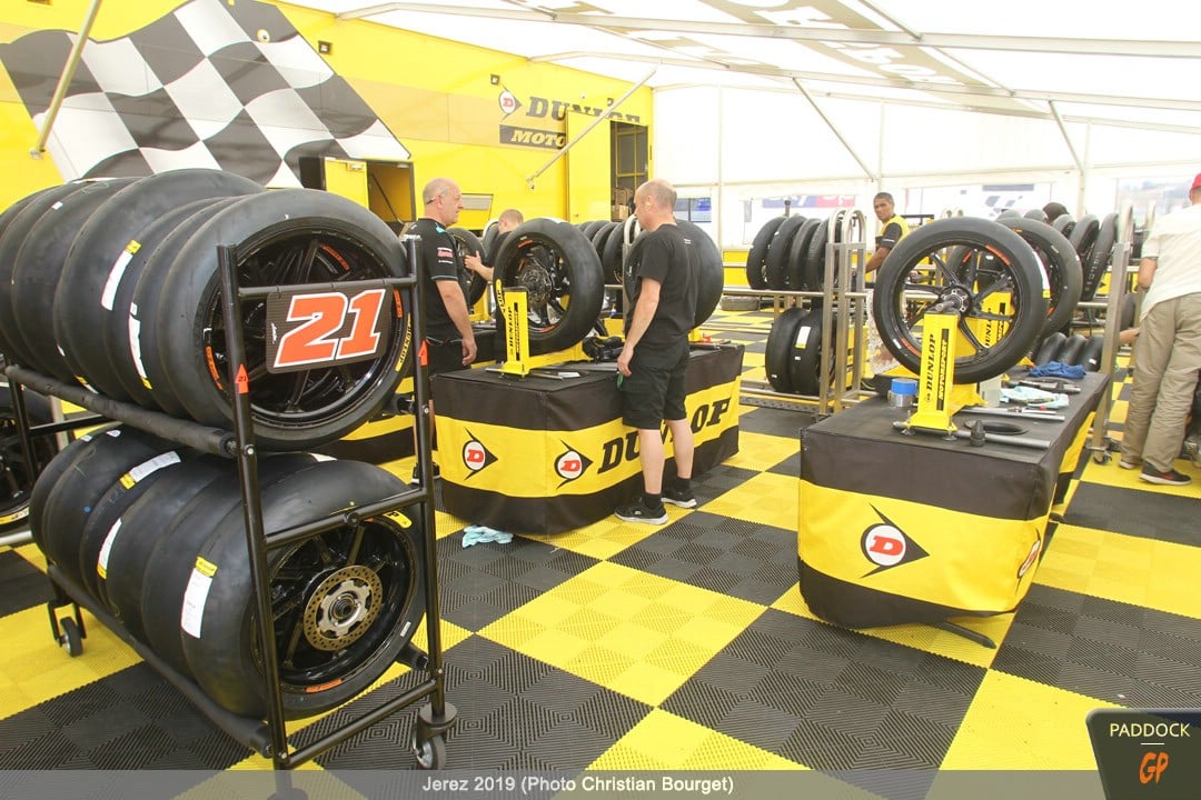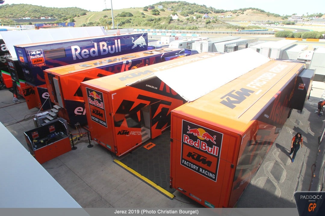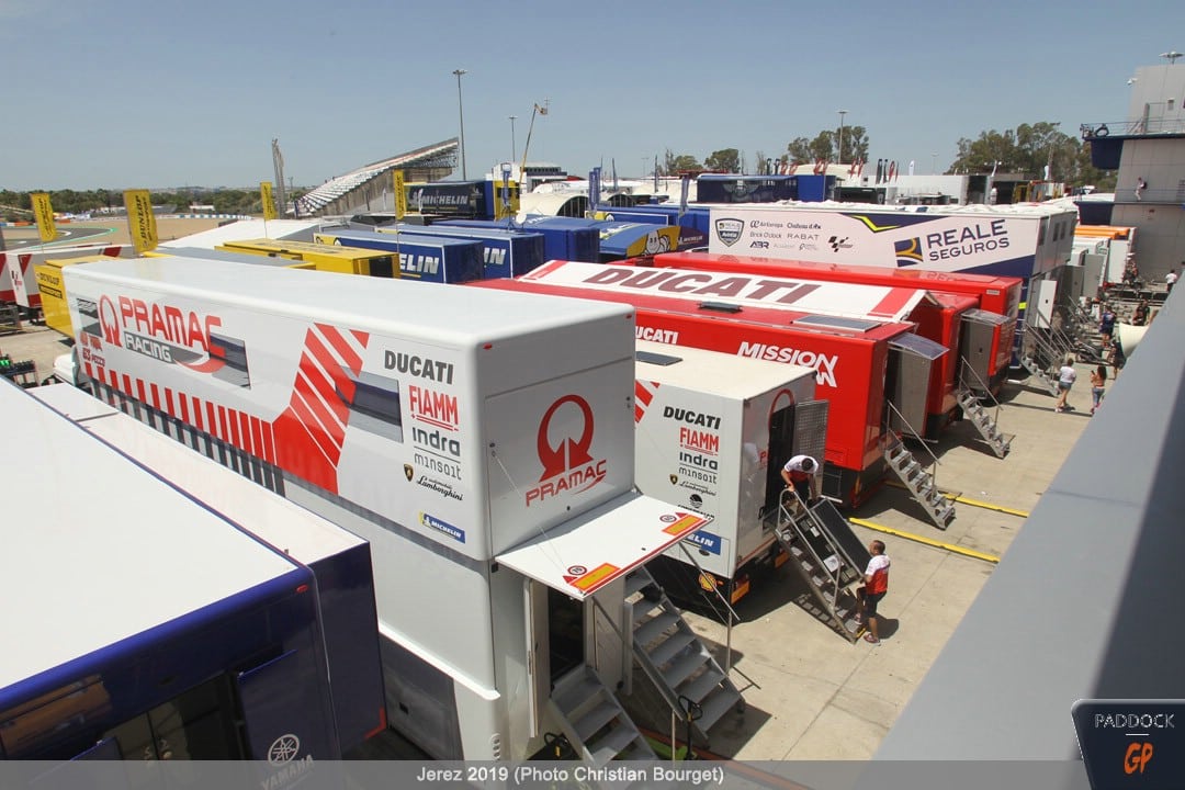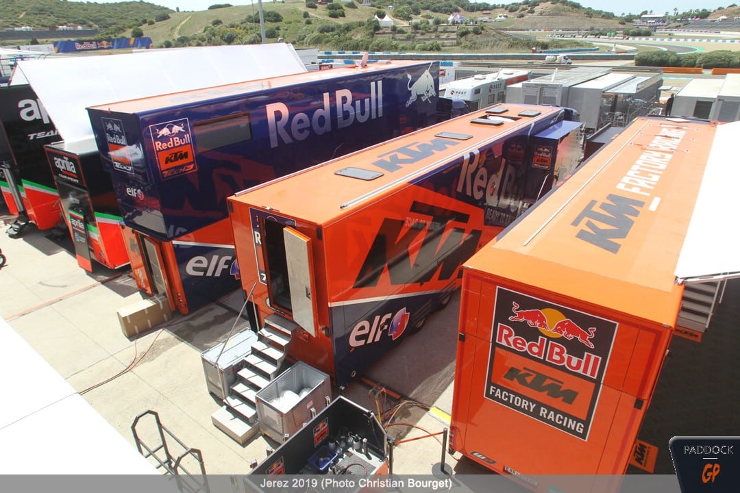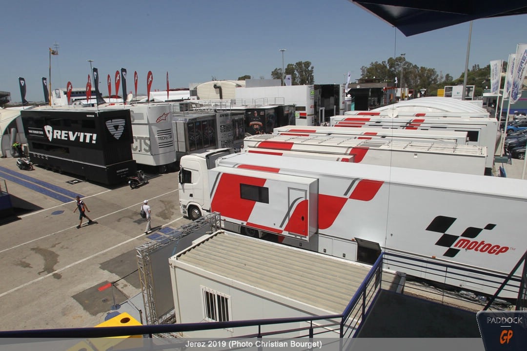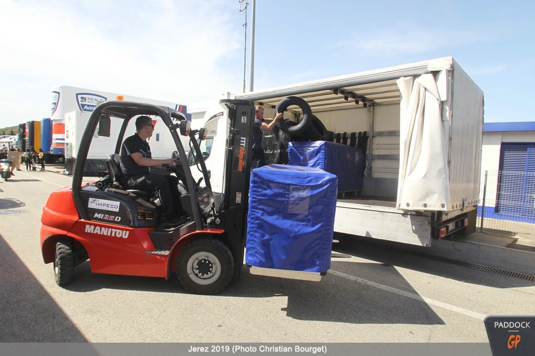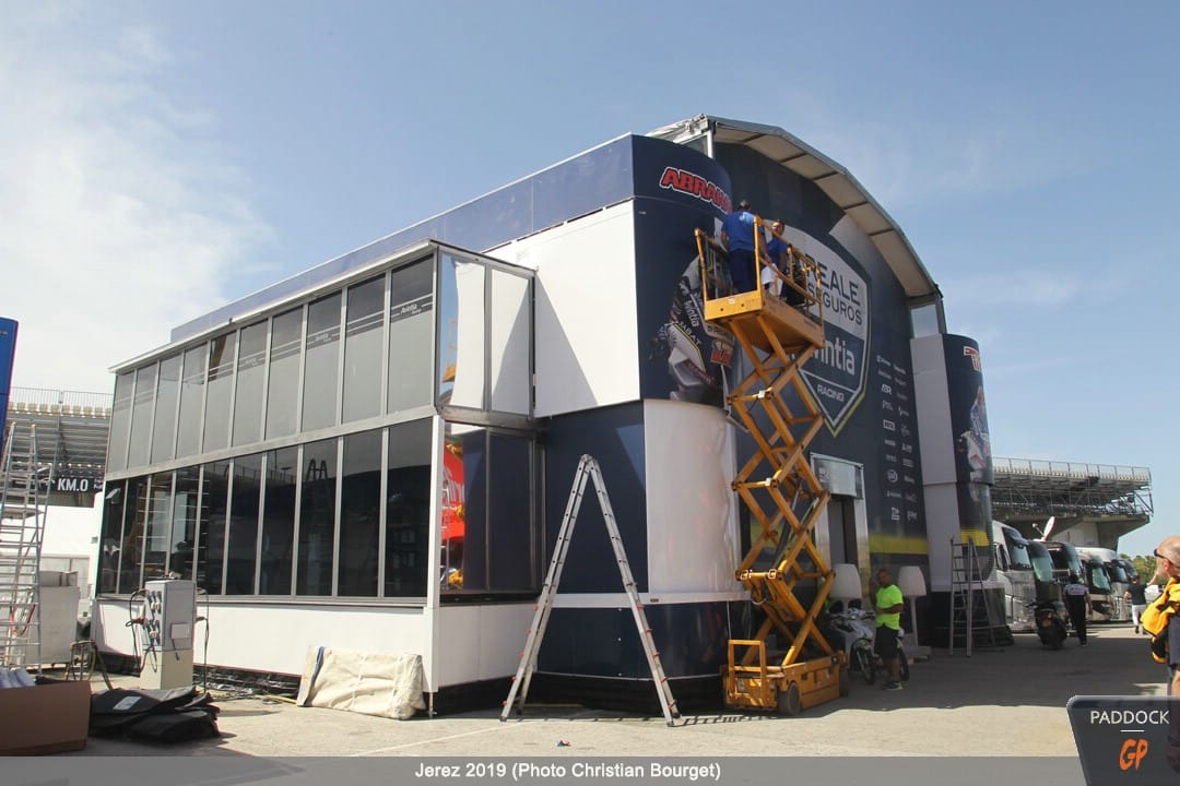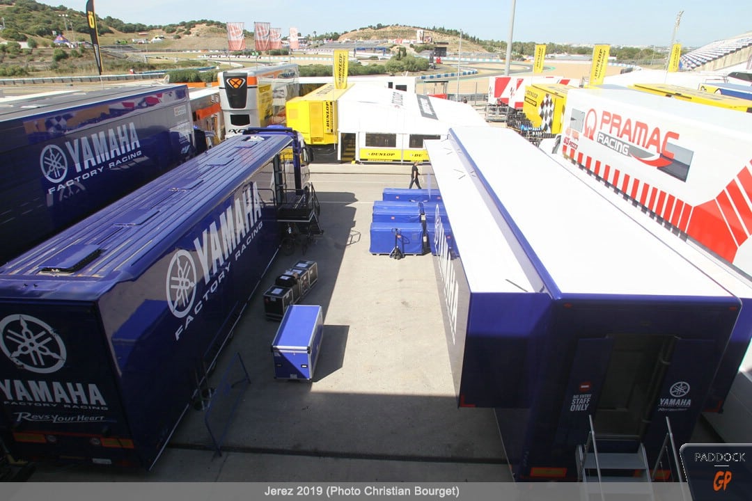 Le jeudi, le paddock est quasiment finalisé pendant que les pilotes s’adressent à la presse et que les mécaniciens démontent et remontent les motos…