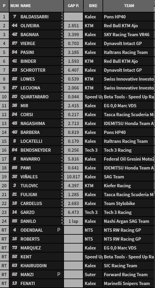 A la mi-course, le classement présente l’ordre suivant : Lorenzo Baldassarri, Miguel Oliveira, Francesco Bagnaia, Xavi Vierge, Mattia Pasini, Brad Binder, Marcel Schrotter, Iker Lecuona, Sam Lowes, Joan Mir et Fabio Quartararo.