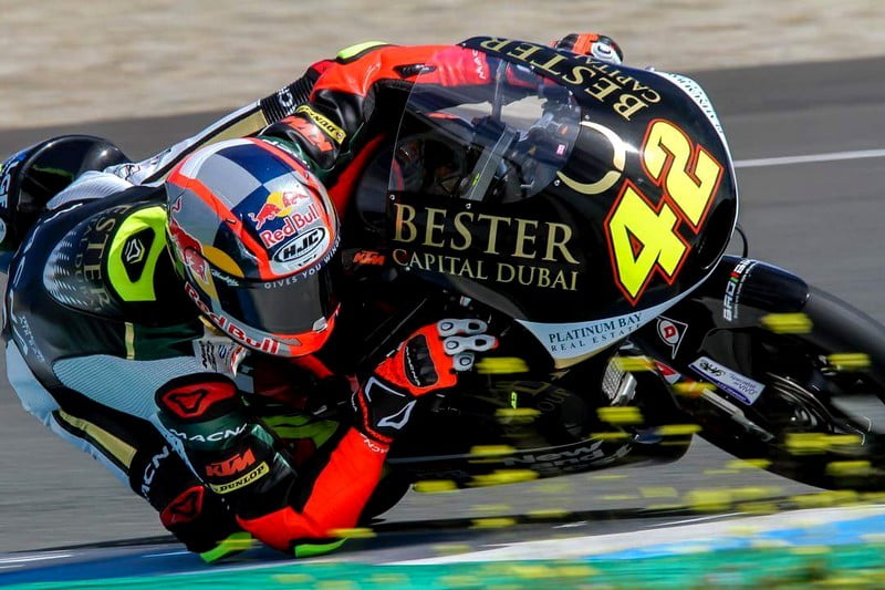 Dans le deuxième tour, Enea Bastianini (Leopard Racing) se fait une grosse chaleur en sortant au-delà du vibreur et évite de peu le contact avec Marco Bezzecchi (PruestlGP). Le rookie Alonso López (Estrella Galicia 0,0), pourtant le plus rapide en piste, commet une erreur dans le virage 9 en tentant de dépasser Philipp Oettl (Sudmetal Schedl GP Racing) dans le groupe de tête. Il se retrouve seizième.