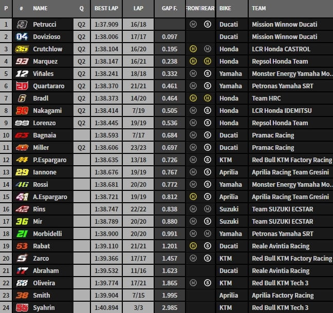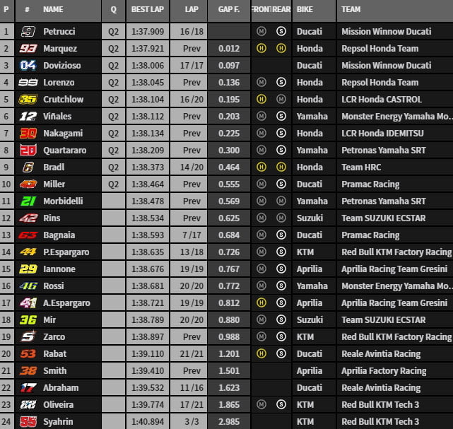Au terme du 2e run, Marc Márquez possède toujours 5/100 d’avance sur Danilo Petrucci, puis viennent Andrea Dovizioso, Takaaki Nakagami, Francesco Bagnaia, Cal Crutchlow, Valentino Rossi, Álex Rins, Jack Miller et Fabio Quartararo.
