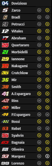 Jorge Lorenzo est alors 11e, Aleix Espargaró 12e, Pol Espargaró 14e, Maverick Viñales 15e et Johann Zarco 21e.