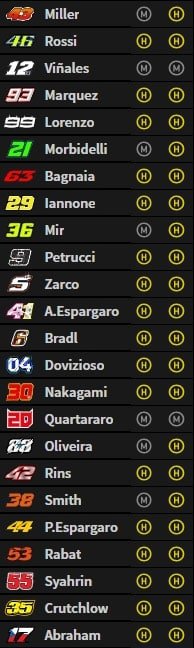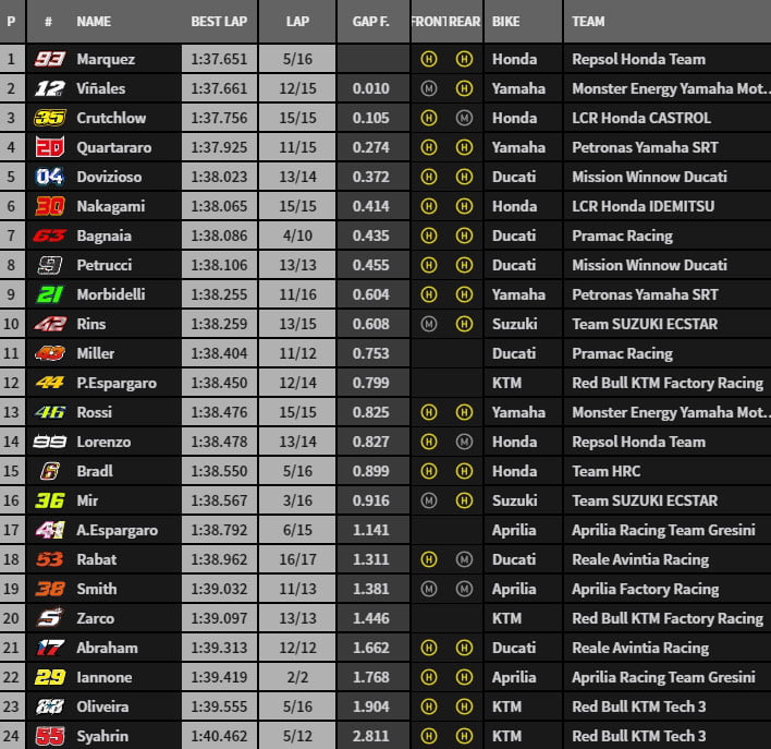 Valentino Rossi est 12e, Cal Crutchlow 14e, Pol Espargaró 16e, Fabio Quartararo 17e et Johann Zarco 19e.