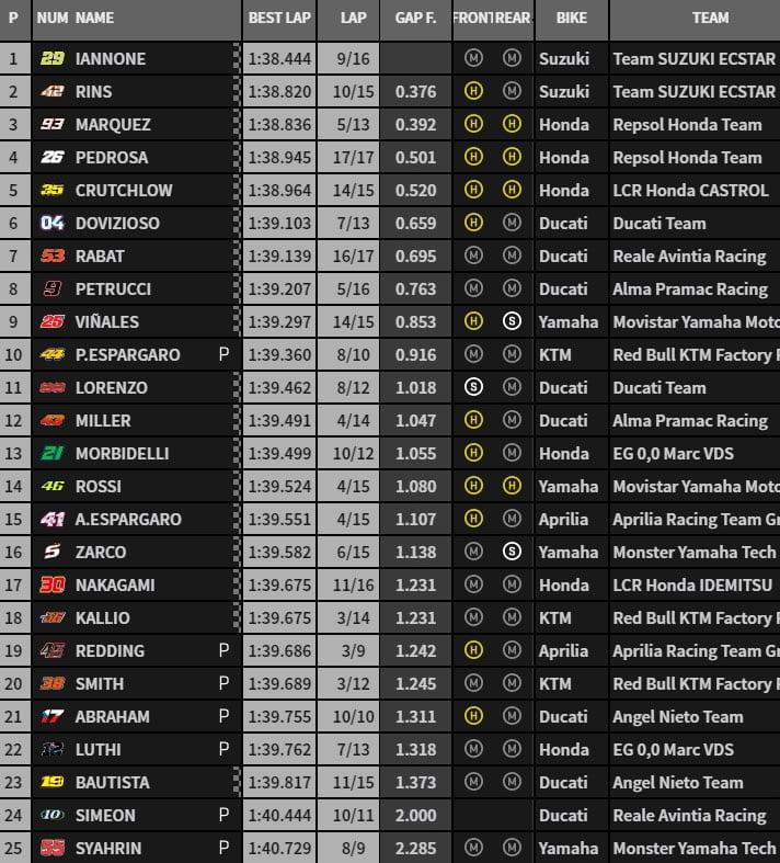 Au passage suivant, Marc Márquez, équipés en dur/dur, réalise 1’39.017 avant que Andrea Iannone ne prenne le commandement pour 8/1000.