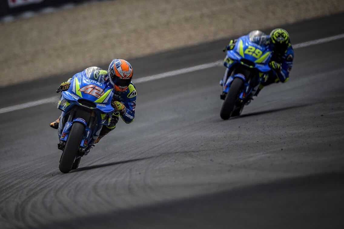 À 8 minutes du drapeau à damiers, Alex Rins porte sa Suzuki en 2e position, derrière son coéquipier Andrea Iannone.