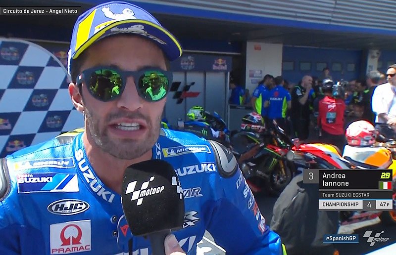 A peine descendu de sa Suzuki GSX-RR officielle après avoir franchi la ligne d’arrivée du Grand Prix d’Espagne en 3e position au terme d’un dernier dépassement sur Danilo Petrucci, Andrea Iannone a confié au micro du site officiel MotoGP.com la progression réalisée malgré un mauvais choix de pneu arrière sur le grille de départ.