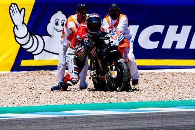 Et pourtant, l’Italien a tout essayé pour rejoindre la course espagnole pour tenter de marquer des points. Jusqu’à repartir avec la Ducati frappée du 99 ! La preuve avec ces images. L’émotion ou tentative désespérée ?